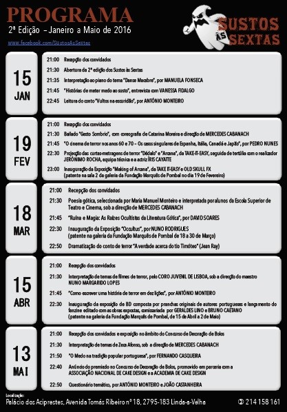 A partir de 15 de Janeiro, o ciclo mensal de palestras sobre horror Sustos às Sextas está de volta à sede da Fundação Marquês de Pombal. Até Maio, o Palácio dos Aciprestes andará assombrado por tertúlias, contos e palestras, músicas, dramatizações e muitos espíritos inquietos. Confiram no programa abaixo e vejam o teaser horripilante realizado pela Thinkers, organizadora do evento, juntamente com o professor António Monteiro.